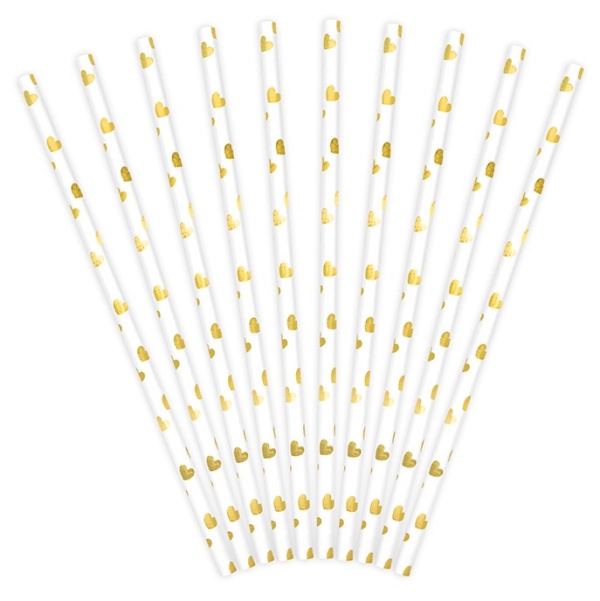 Papierové slamky biele so srdiečkami v zlatej metalickej farbe